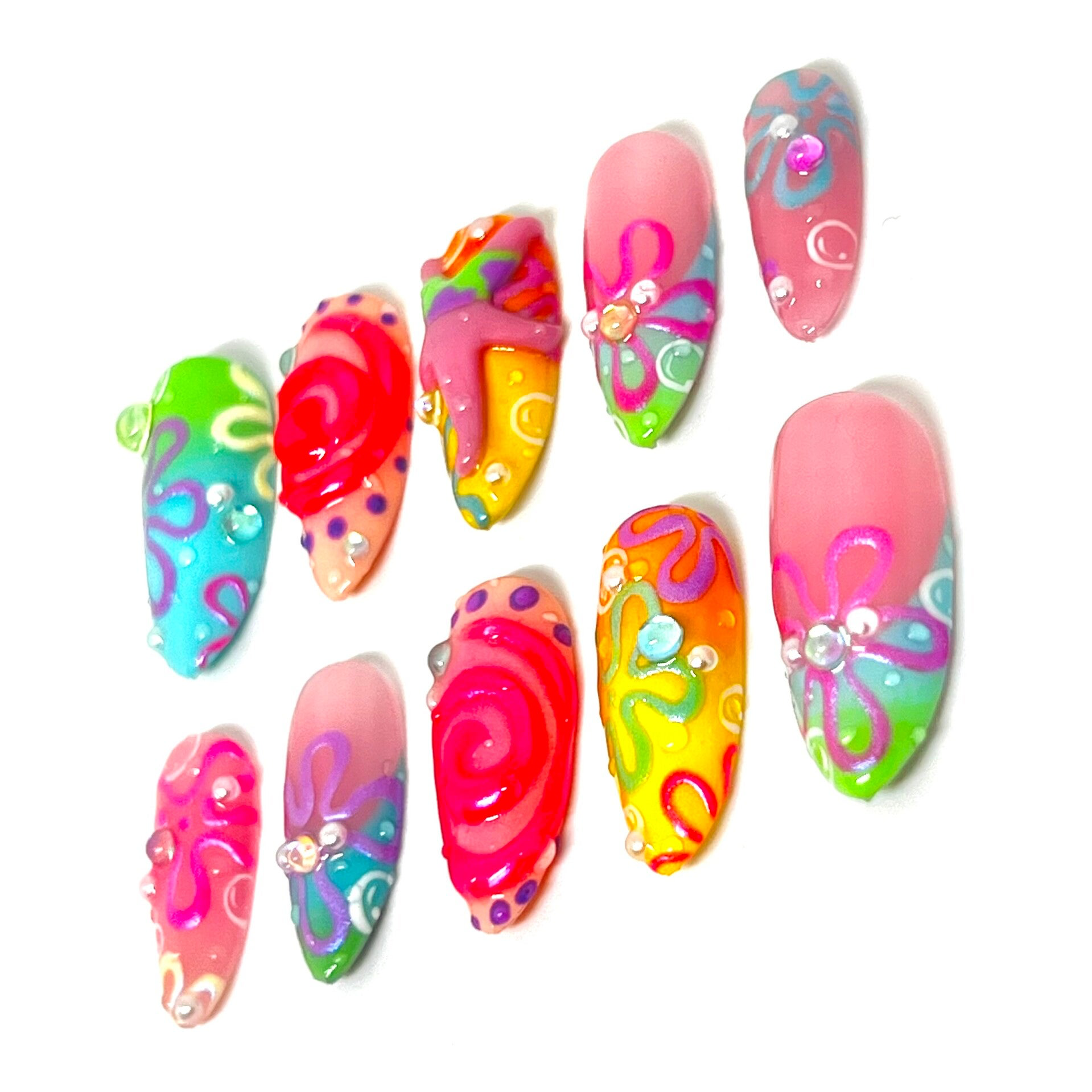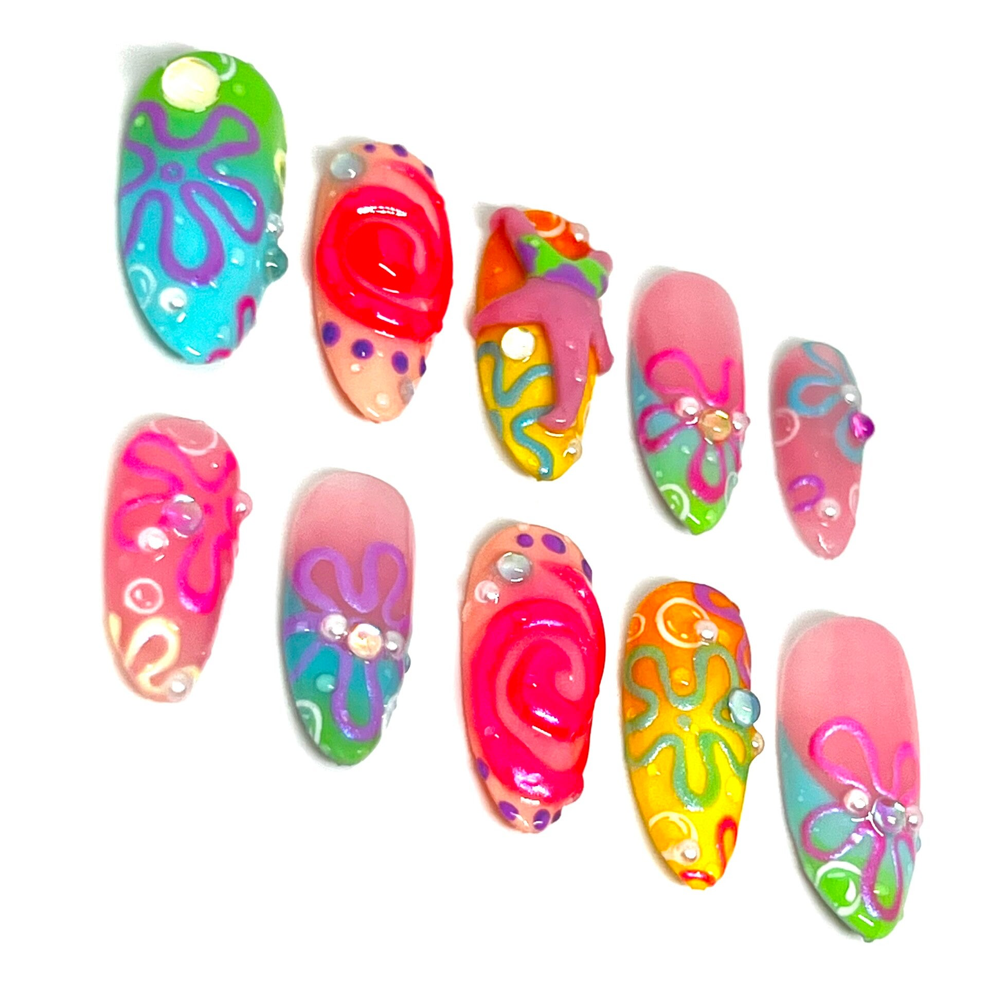 - Hand painted, gel press on nail set inspired by 'SpongeBob Squarepants'